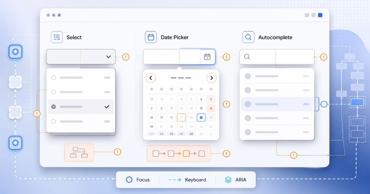The three widgets this article covers — custom selects, date pickers, and autocomplete fields — are the ones where the gap between “looks like it works” and “actually works” is widest. They reward teams that commit to the engineering cost, and they punish teams that treat accessibility as a last-minute ARIA patch on top of a <div>.