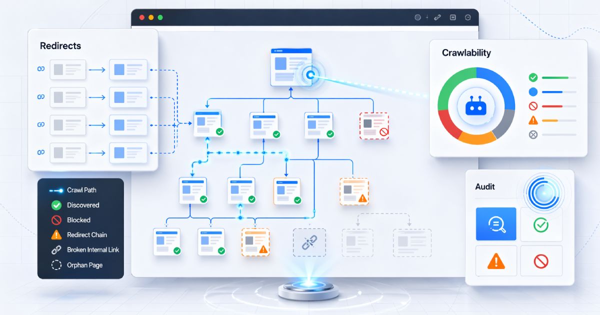- A post-migration crawlability audit focuses on four pillars: redirect integrity, discovery (sitemaps and internal links), crawl access (robots.txt), and canonical alignment.
