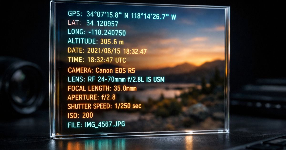 A photo looks harmless when viewed on a screen. The pixels show what was in front of the lens — a product, a landscape, a workspace, a person. What the pixels do not show is the hidden data payload that travels with the file: the exact GPS coordinates where the shutter fired, the precise date and time of capture, the make and model of the device, the software used to edit it, and sometimes the name of the photographer embedded in a copyright field.