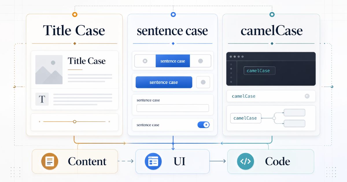 This guide separates the four decisions teams conflate: sentence case, title case, technical casing (camelCase, PascalCase, snake_case, kebab-case), and ALL CAPS. Each has legitimate uses. None of them is universally correct.